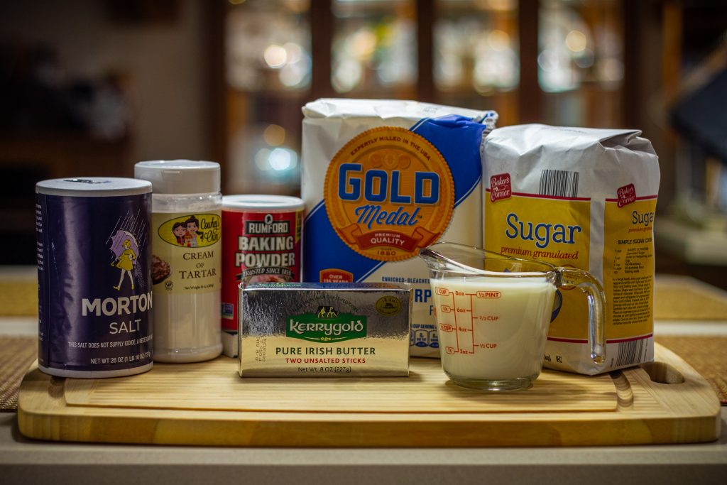 Mix all the dry ingredients. Cut the butter into small cubes. As a shortcut, you can use a cheese grater. Then add the butter and milk to the dry ingredients and bit just enough that it’s held together. Roll out to the desired size, folding over several times. Cut out with a cup or other cutter shape. Add to a greased sheet. Cook for ~15 minutes at 400. Remove once golden brown on top.